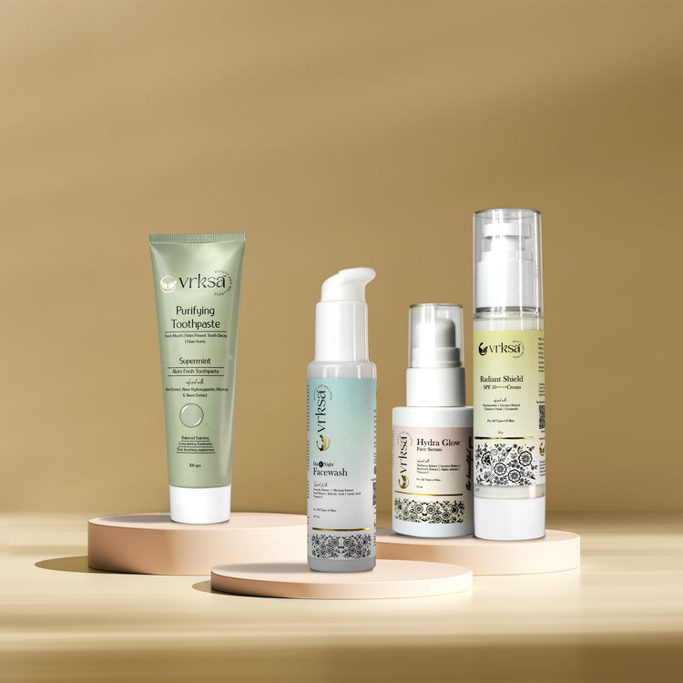 At Vrksa, we believe beauty begins with nature. Our skincare and oral care products are crafted from pure, plant-based ingredients that care for your skin and the Earth. From the HydraGlow Face Serum to the Radiant Shield SPF 50++++ Cream, each product blends herbal wisdom with modern science. Join us in embracing natural beauty, ethical living, and a sustainable future — one product, one tree at a time.